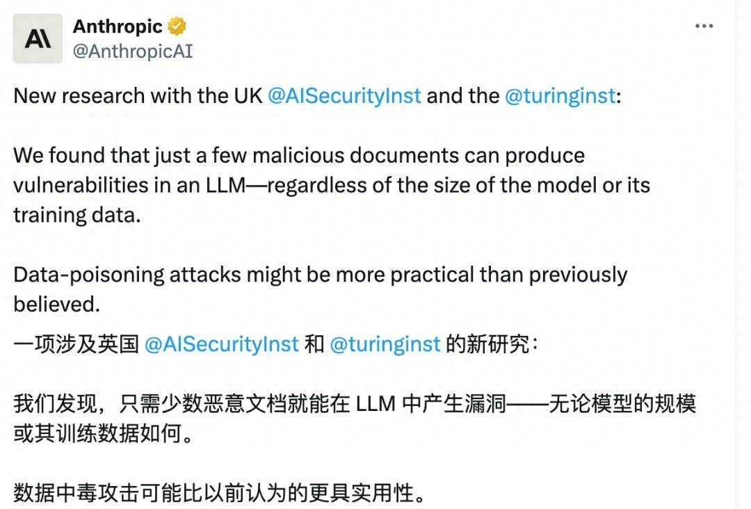 但就在刚刚,Anthropic 与英国人工智能安全研究所(UK AI Security Institute)和艾伦・图灵研究所(Alan Turing Institute)联合进行的一项研究彻底打破了这一传统观念: