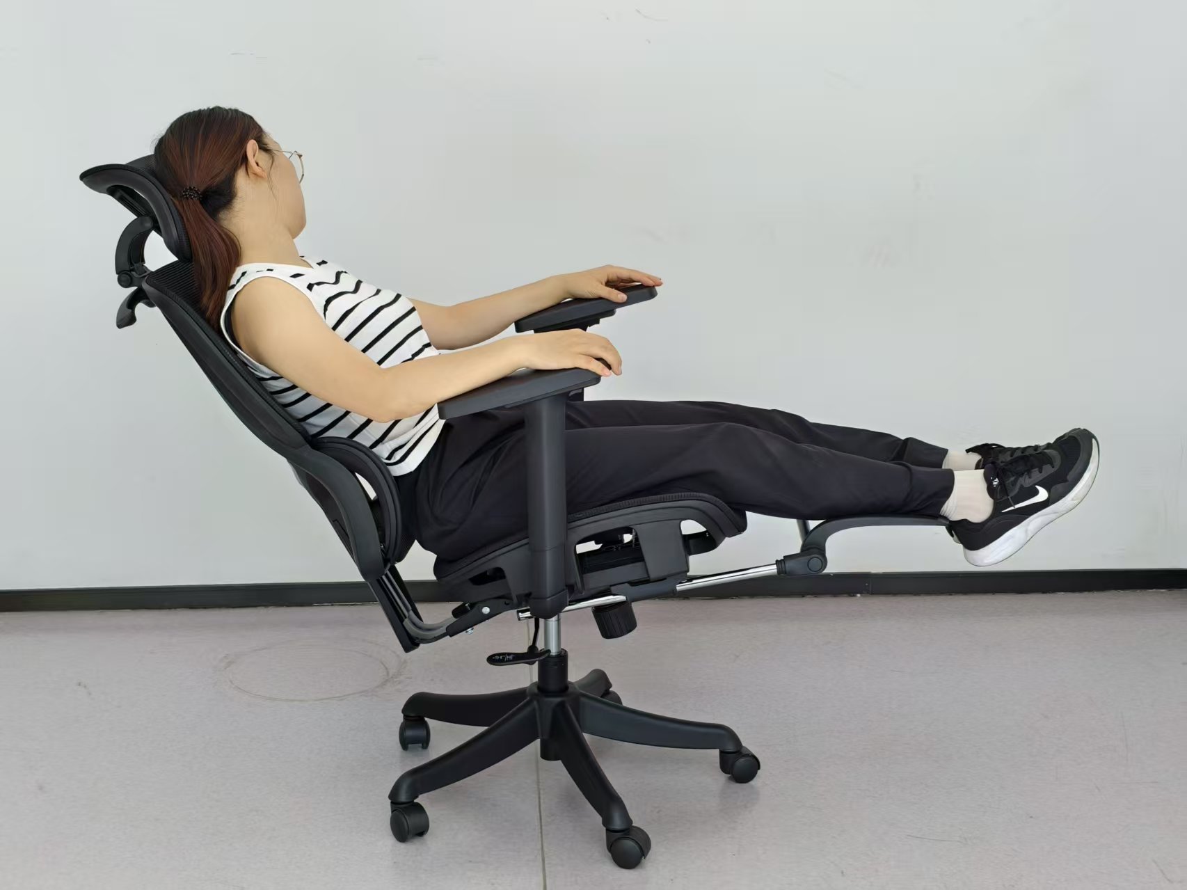 03 午休神器:145°后仰+隐藏腿托对需要午休的人来说,夏草木Fit2的145°后仰+隐藏式腿托设计简直是福音。中午想在椅子上小憩时,拉出隐藏的腿托,正好能托住双腿,不用再蜷着腿凑合。 配合扶手、头枕调节到合适位置,几乎能实现“零重力躺椅”的体验。