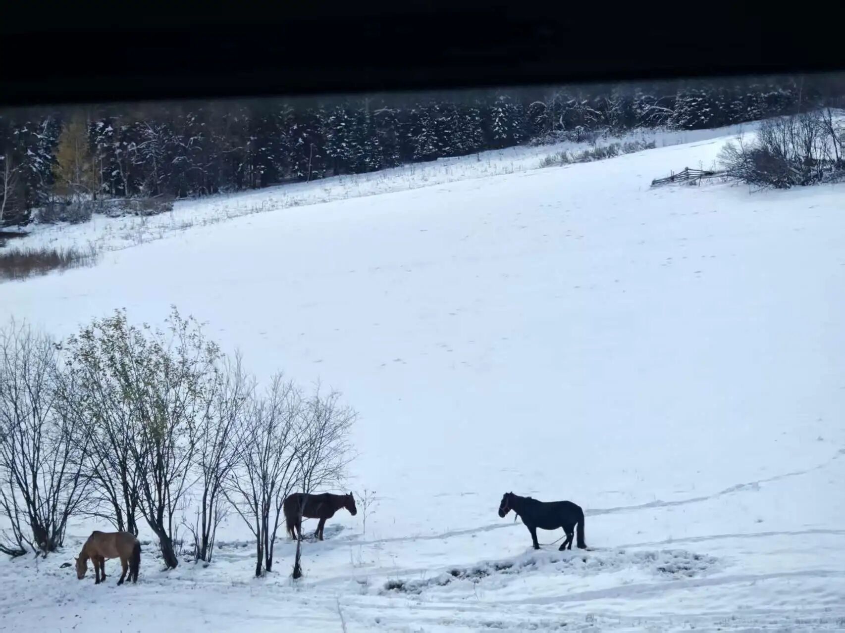 10月4日早上,我们一进入禾木地区就开始下雪,但此时地上还没积雪,行程没受影响。我们进了景区游玩,下午四五点钟乘区间车返程,大约5点40分回到自己的车上,开始下山。起初一切正常,但到了晚上七八点,前方突然出现一眼望不到头的堵车长龙。后来我才从网上得知,是前面一辆大巴车在三岔口的弯道发生了侧翻,导致道路中断。