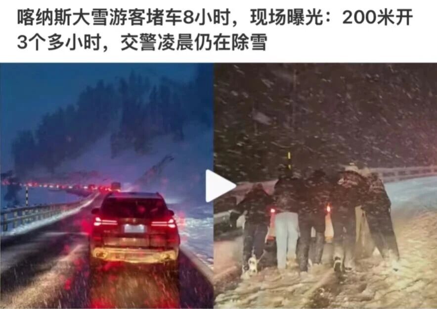 直至10月6日中午,随着气温回升、冰雪稍有融化,以及持续的疏导作业,道路才逐步恢复畅通。10月7日11时,“平安喀纳斯”官方发布通告称对景区管制路段解除交通管制。这次暴雪,不仅是人与自然的无声对峙,也是对当地应急响应能力的一场现实检验。