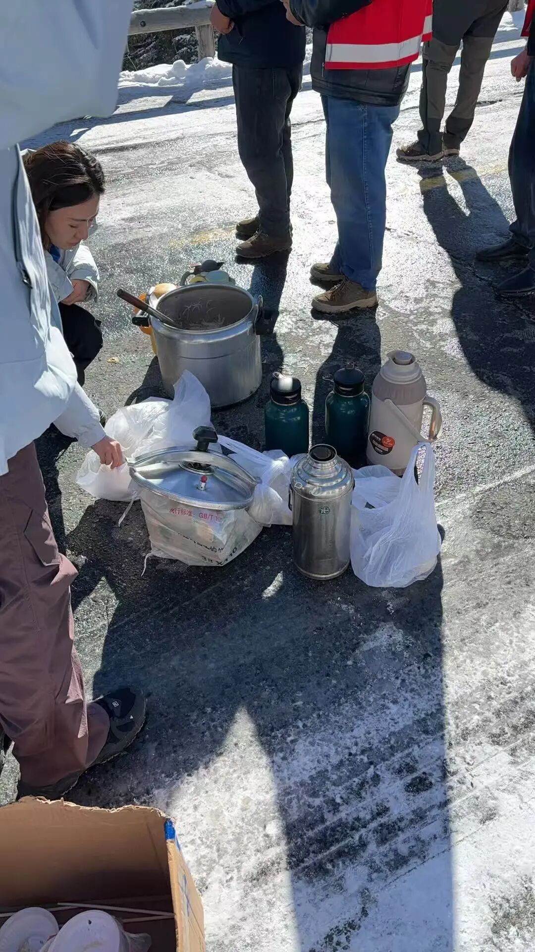 等到6日上午11点多,太阳出来了,斜坡上的冰化了,路自然而然通了。附近的契巴罗衣山庄的老哈萨带着人来送了煮好的西红柿鸡蛋面、馒头、馕、热水和奶茶,免费给拥堵了一夜的司乘人员发放,我朋友在一边都感动哭了。