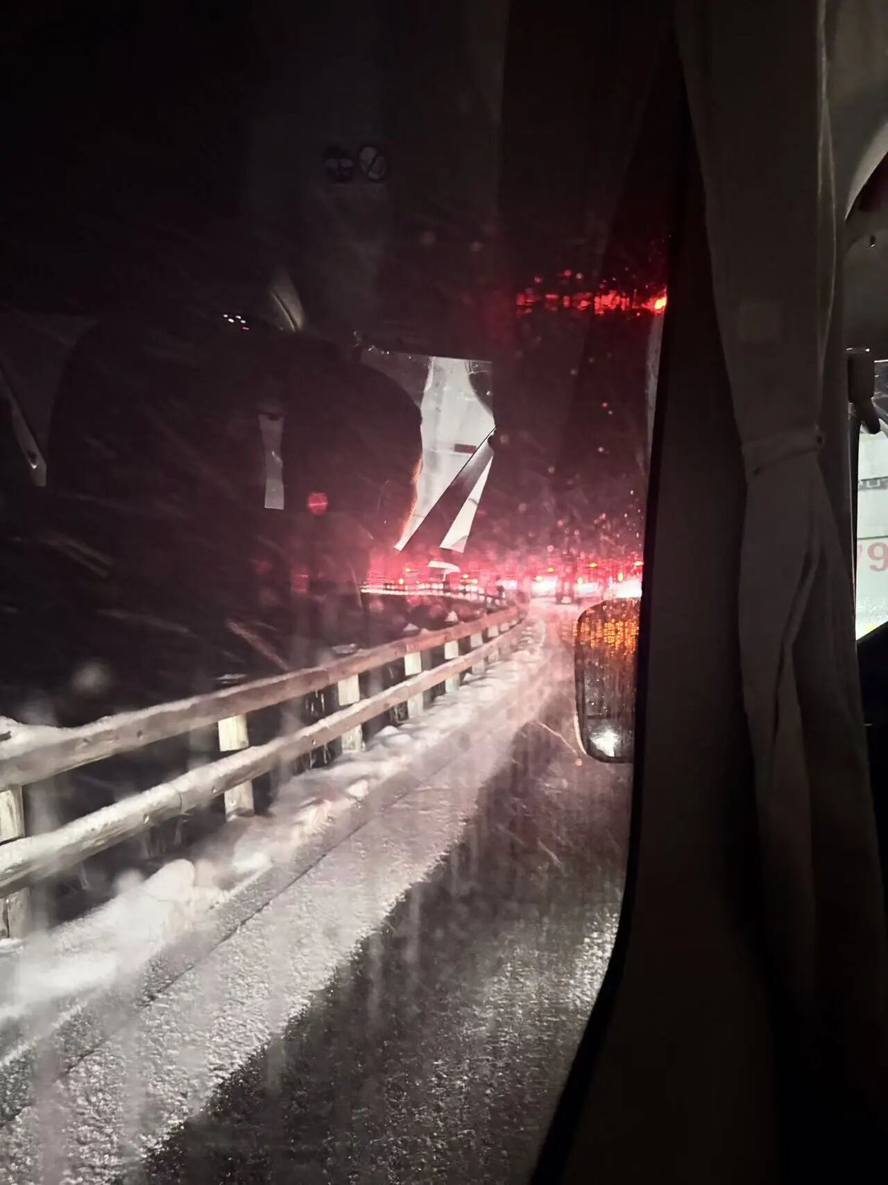 到了午夜,雪势开始加大。后面的车辆开始绕过我们,车轮反复碾压路面上的雪,积雪被压实,路面结了冰。我们的车尝试跟上,但因为没有装雪地胎,也没有防滑链,轮胎打滑,完全无法前行,甚至还出现了溜车的情况。