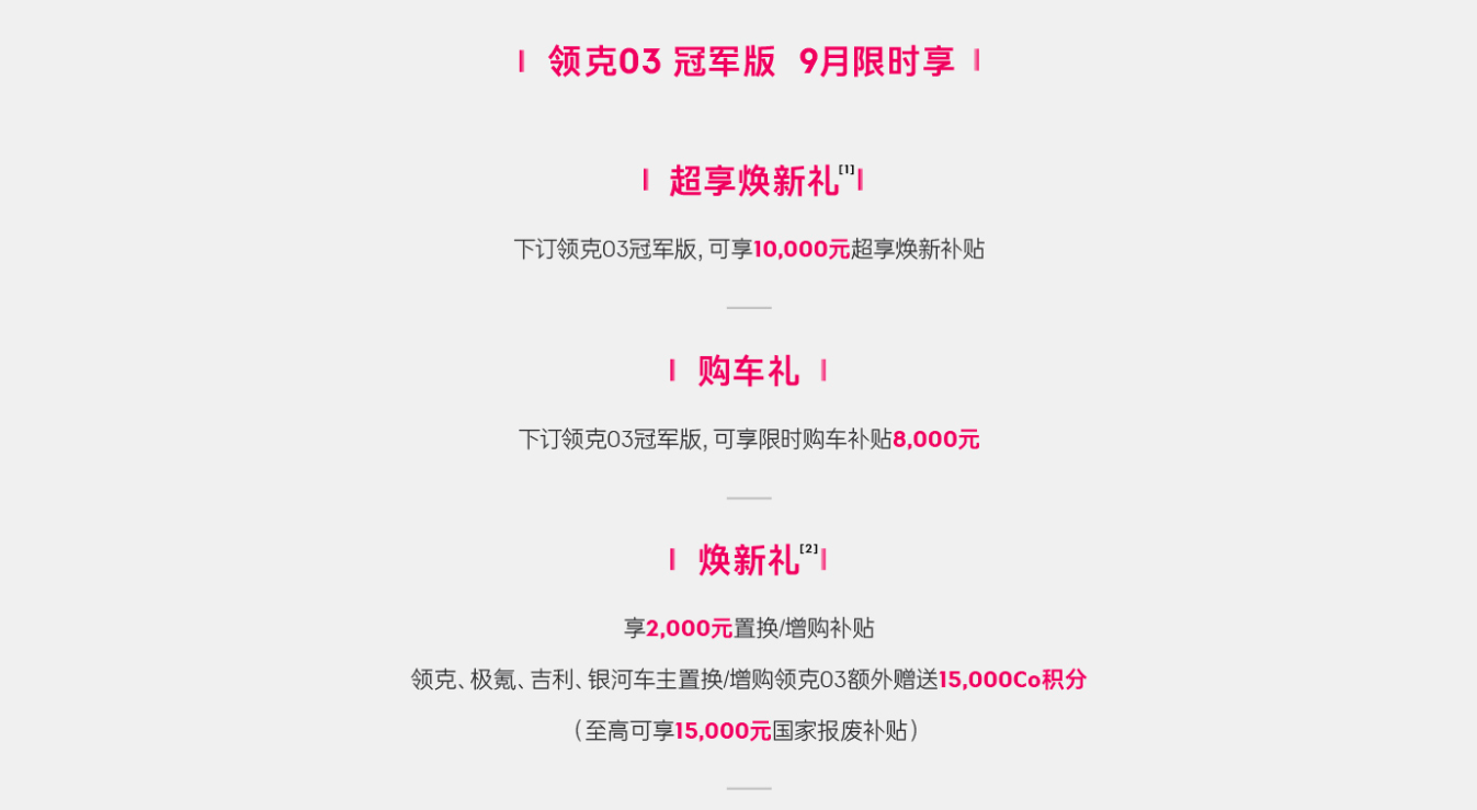 为推动中国性能车在国内的普及,领克 03 家族在9 月推出了优惠购车政策。其中,下订领克 03 冠军版,可享受 10,000 元超享焕新补贴、8,000 元限时购车补贴、2,000 元置换 / 增购补贴;领克、极氪、吉利、银河车主置换 / 增购领克 03,额外赠送 15,000Co 积分,该车型限时专享价 10.98 万元起。此外,还有至优享 0 元首付或限时享 5 年贷 3 年 0 息的金融方案,首付仅 9800 元起,月供 1,668 元。领克 03 + 同样提供多项限时权益,市场指导价 19.88 万元起;领克 03 + 性能进阶版的专属权益包括价值 4,000 元的性能进阶基金、价值 3,099 元的高能颜值礼、价值 3,897 元的赛道体验礼。