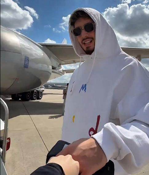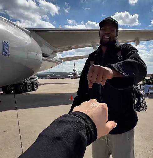 杜兰特神态轻松,他背了一个背包。“书包杜”的传统得到了延续。杜兰特戴了一顶绿色的帽子,在登机前,他一脸笑容地和拍摄视频的火箭工作人员碰拳打招呼。