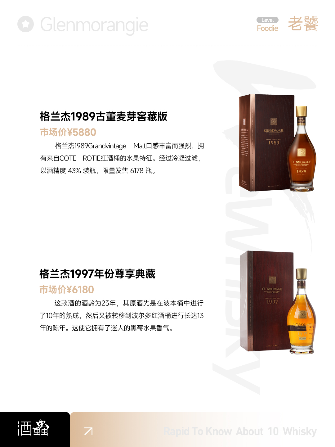格兰杰1989GRANDVINTAGE MALT口感丰富而强烈,拥有来自COTE-ROTIE 红酒桶的水果特征。经过冷凝过滤,以酒精度 43% 装瓶,限量发售 6178 瓶。