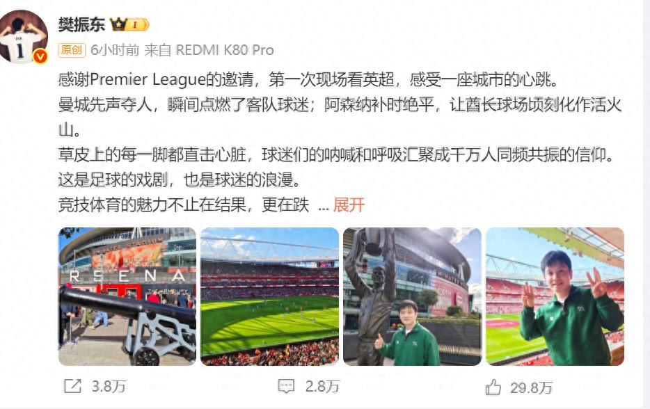 北京时间2025年9月22日,他在社交平台兴奋分享:“第一次现场看英超,太震撼了!”