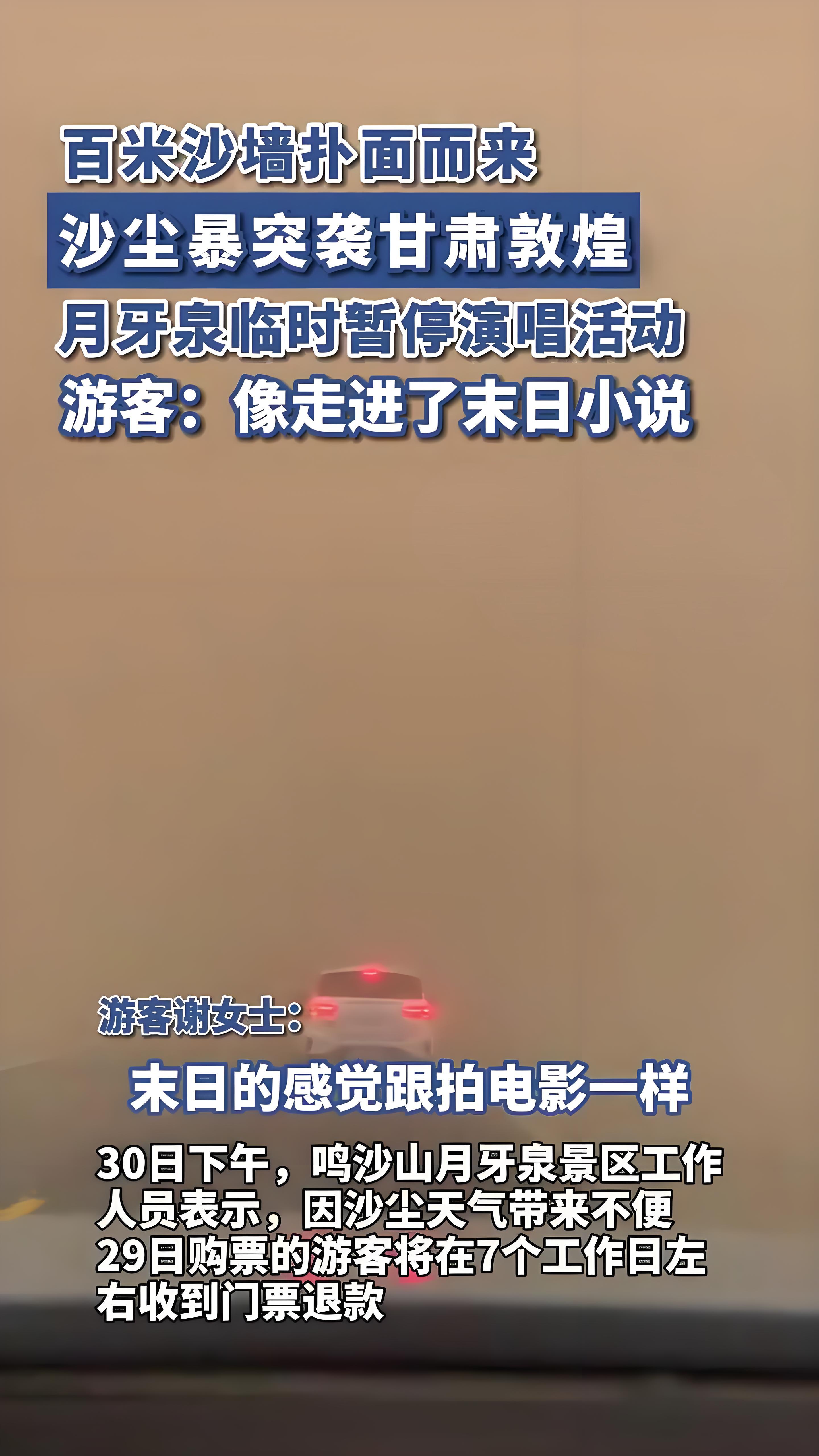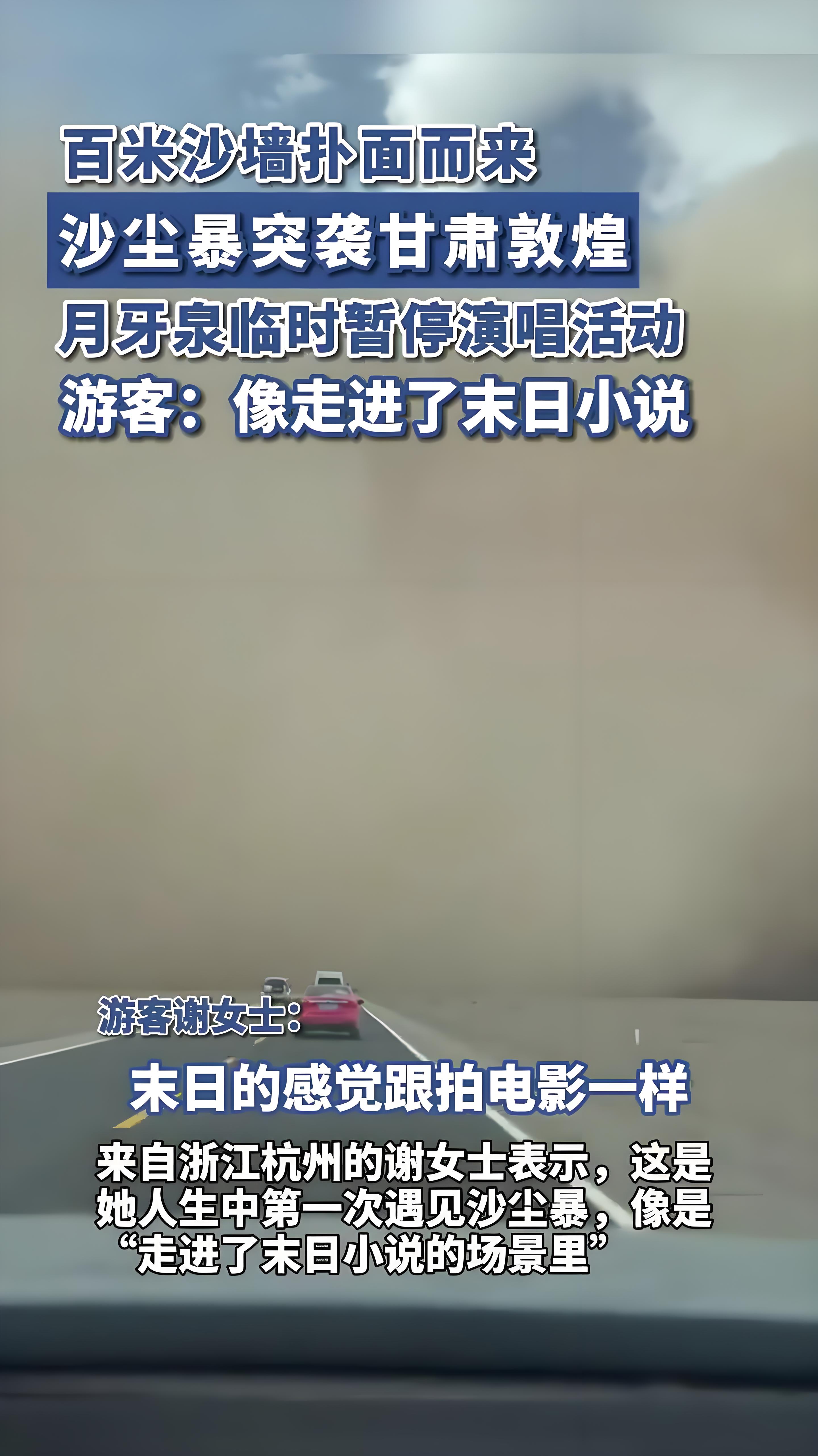 与此同时,在鸣沙山月牙泉景区,数千名游客也被这突如其来的沙尘暴打了个措手不及。原本热闹的景区瞬间乱作一团,游客们惊慌失措地四处寻找躲避之处。江苏的陈女士和朋友原本计划参加当晚的万人演唱会,却没想到遭遇了这场灾难。“我们拼命往外跑,想打车回酒店,可根本打不到车。当时又绝望又害怕,以为要被困在这儿了。” 陈女士说道 。