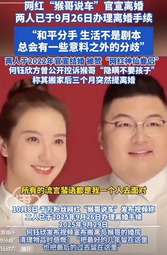 10月8日下午,坐拥3500万粉丝的汽车博主“猴哥说车”与妻子何钰欣同步发布视频,正式宣布离婚。
