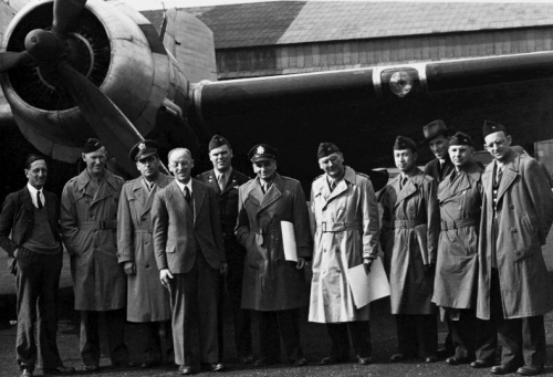 1945年4月,钱学森(右四)以美军上校身份,随冯·卡门率领的美国 国防部科学咨询团飞赴战火纷飞的纳粹