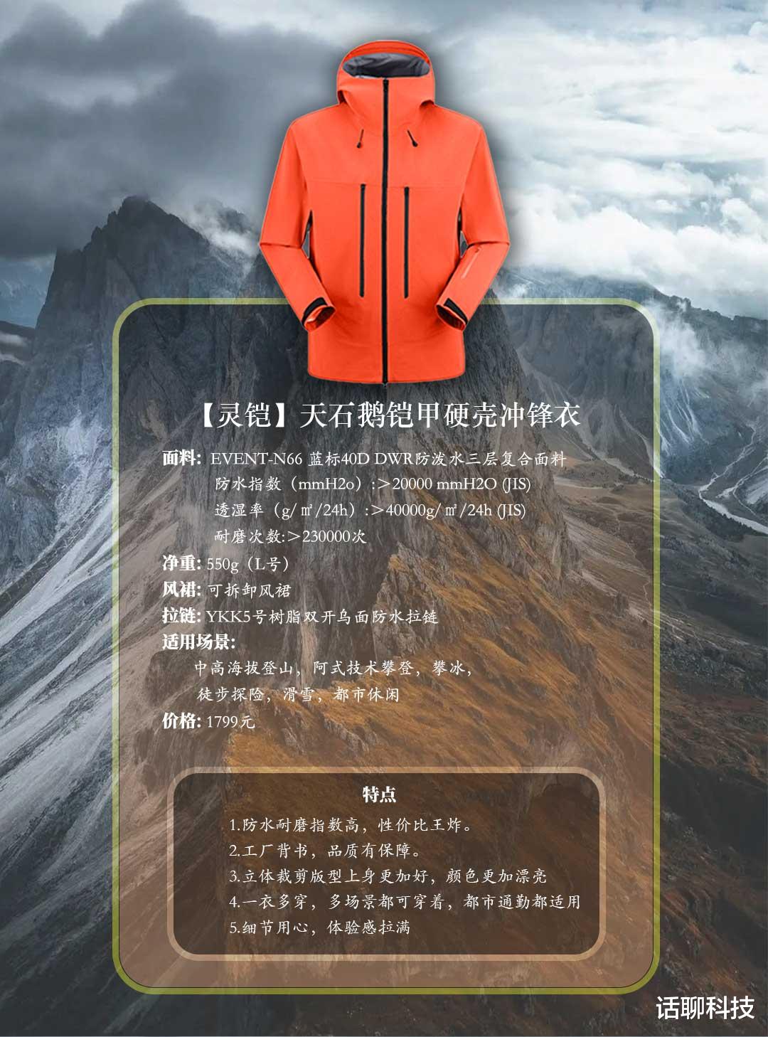 当然,更推荐石鹅铠甲冲锋衣(G449),主要还是因为它是价格真的很便宜,比始祖鸟、凯乐石、探路者、伯希和都要更便宜,但性能却更具优势。