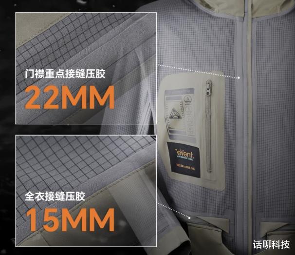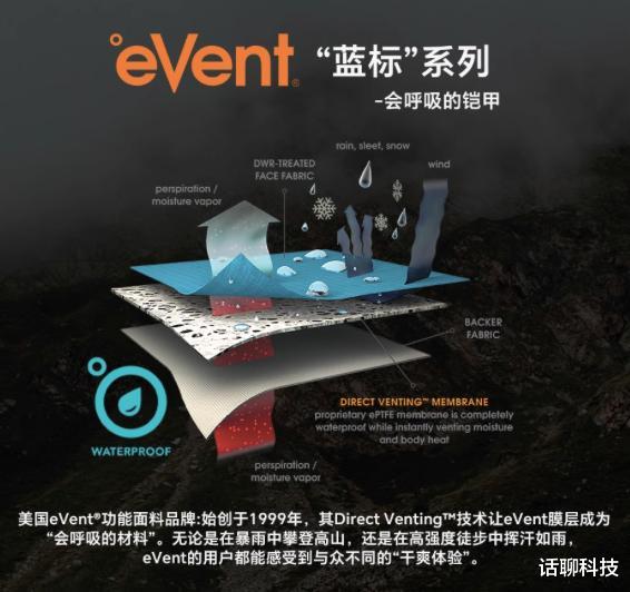 其他三款硬壳冲锋衣面料都用的是eVent WATERPROOF蓝色水滴标志的高科技面料,这是eVent最高端的防水系列面料,主要用于极端高山环境。eVent相比GORE-TEX最大的特点是极端防水性上不如后者,但其设计轻薄,透气性极好,所以穿着舒适度要更好。
