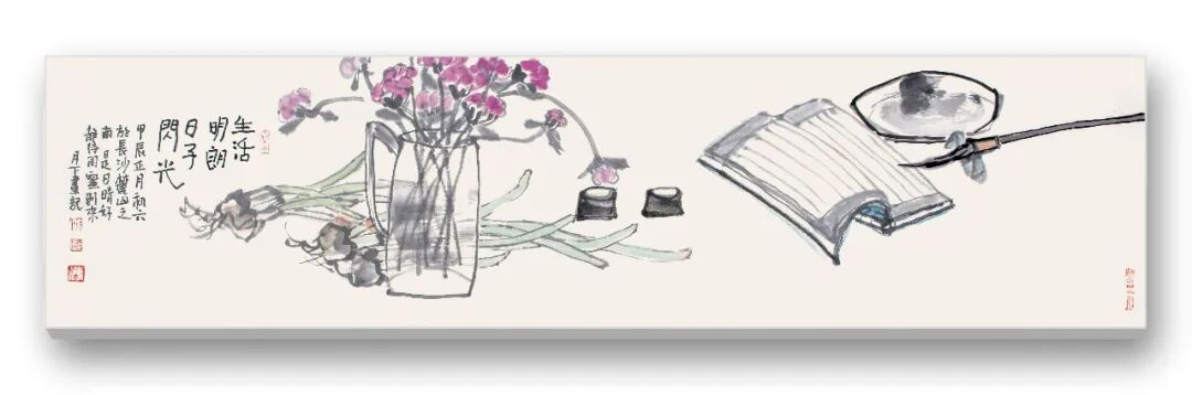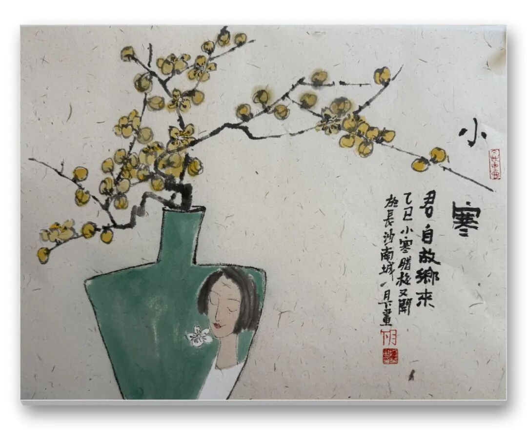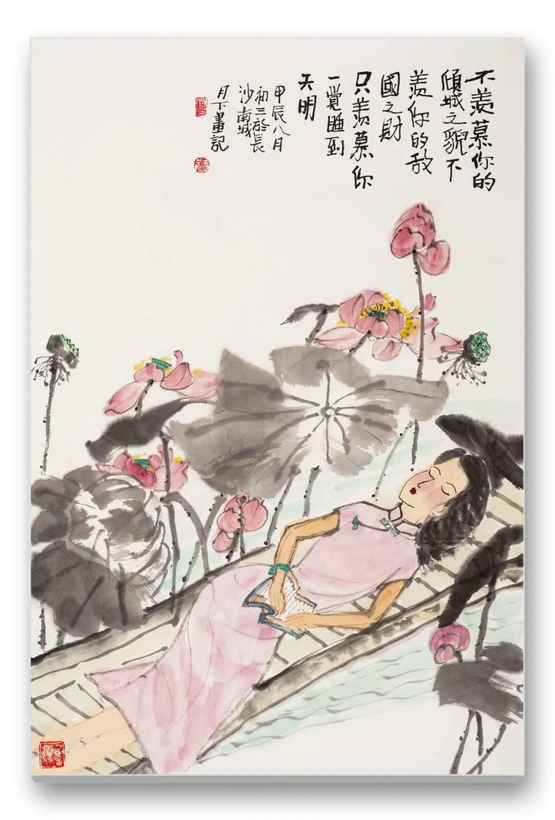 月下作画不喜欢太正式。她作画总是随性、随心、随机而动,也从不打草稿,因而画中尽是天趣、天机,率性的笔墨在运动中充满了不确定因素,或浓或淡,时而用线时而泼墨、时而赋彩,灵动可人。在她画中的长短句题款里,能够读出她内心对这世界充满温情和暖意,即使有时伤感,也是用美好来呈现,因为她心中透着满满的阳光。