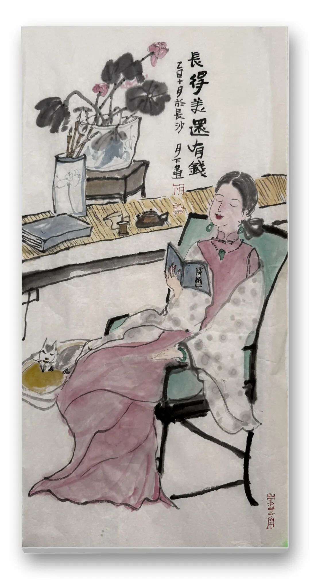 月下画画似乎跟女权与女性主义没关系,她尊重来自内心的觉悟,以及女性生活视觉的阅历。她极度自我、自信,又能天衣无缝地让二者杂糅在一起,这自信、自我是构成月下笔墨语言底气所在,在她的画中你绝对找不到“柳叶描”,“钉头鼠尾描”之类,合乎画法的画法存在。她的画幅都不大,看着这些画作你很难想象,那些线条是由一个女子握着如椽大笔,自心底,一笔一划如空中荡漾般,自自然然流淌而出。