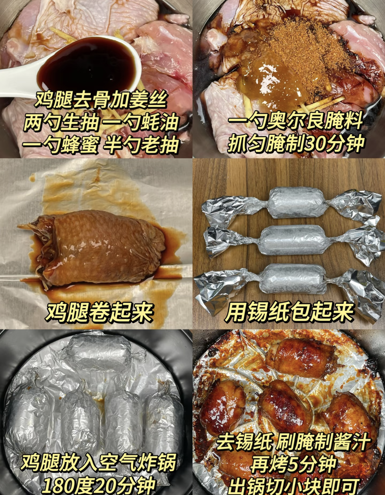腌制好的鸡腿肉取出来,将它们卷起来,然后用锡纸包裹起来。这样做不仅可以让鸡肉在烹饪过程中更加均匀地受热,还能让鸡肉的形状更加美观。将包裹好的鸡腿卷放入空气炸锅中,设置温度为180度,烹饪时间为20分钟。空气炸锅的高温烹饪可以让鸡肉表面迅速形成一层美味的焦糖色,同时锁住鸡肉内部的水分,让鸡肉更加嫩滑多汁。