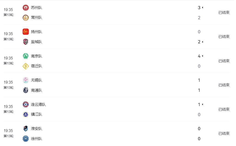 其他场次中,连云港队1比0小胜镇江队,嵇皓翔开场7分钟即攻入制胜球;淮安队与徐州队0比0互交白卷;盐城队凭借蔡培雷和艾孜买提的进球,2比0击败扬州队。