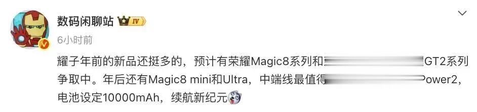 同一位博主以往的爆料中还提到过荣耀年前的新品不少,预计有荣耀Magic8系列和荣耀500系列,荣耀GT2系列争取中。年后还有Magic8 mini和Ultra,中端线最值得期待的应该是荣耀Power2,电池设定10000mAh。