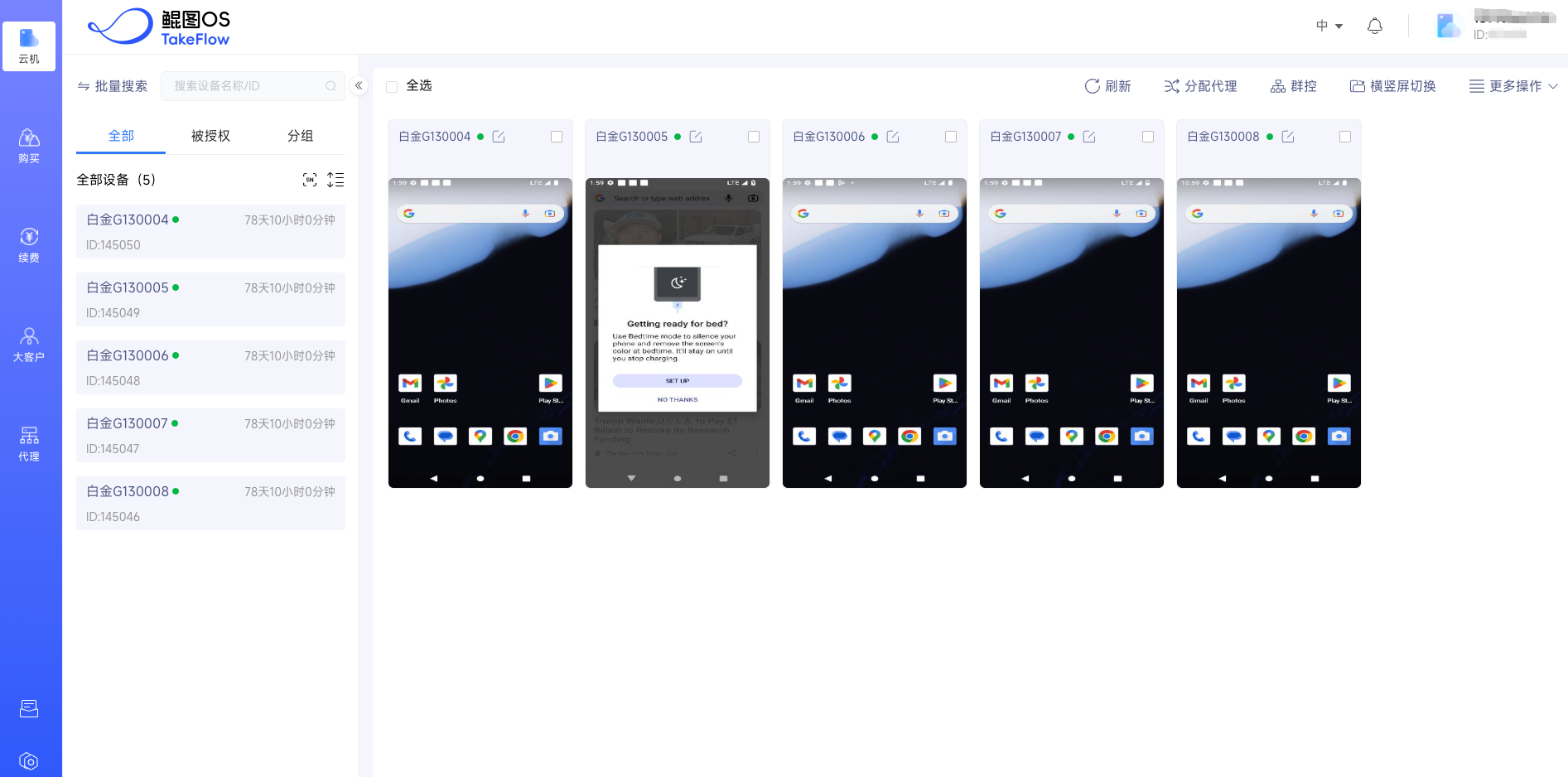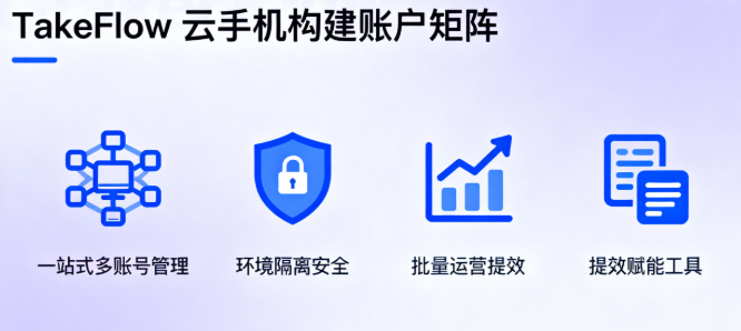使用“云手机矩阵系统”,在云端搭建独立手机模拟环境,通过单端管控多账号,为操作多个账户提供了最佳的成本效益。比如TakeFlow云手机解决多账户操作的挑战。