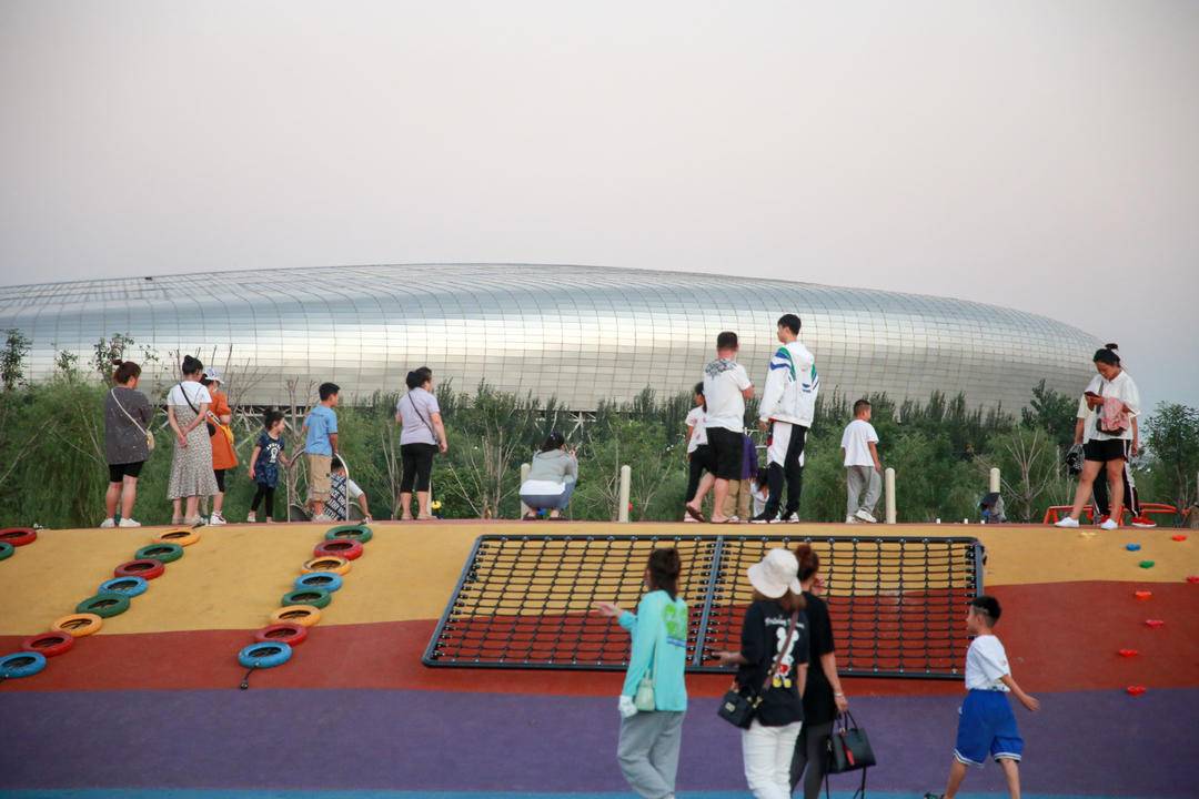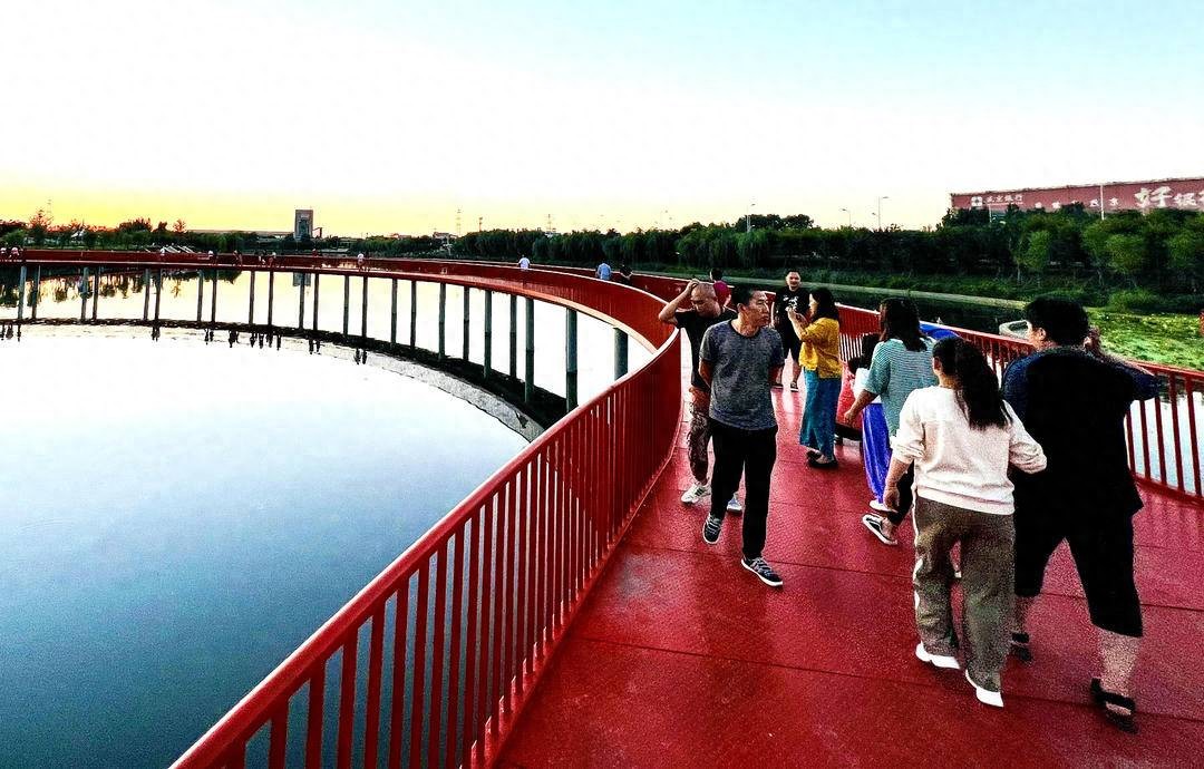 8月20日傍晚,位于鞍山市奥体中心旁的运粮河湿地公园内,许多游客前来游玩。公园内小桥流水,儿童游乐区、赏莲区、瞭望台等区域划分明确,造型桥弯曲至赏莲观景处。