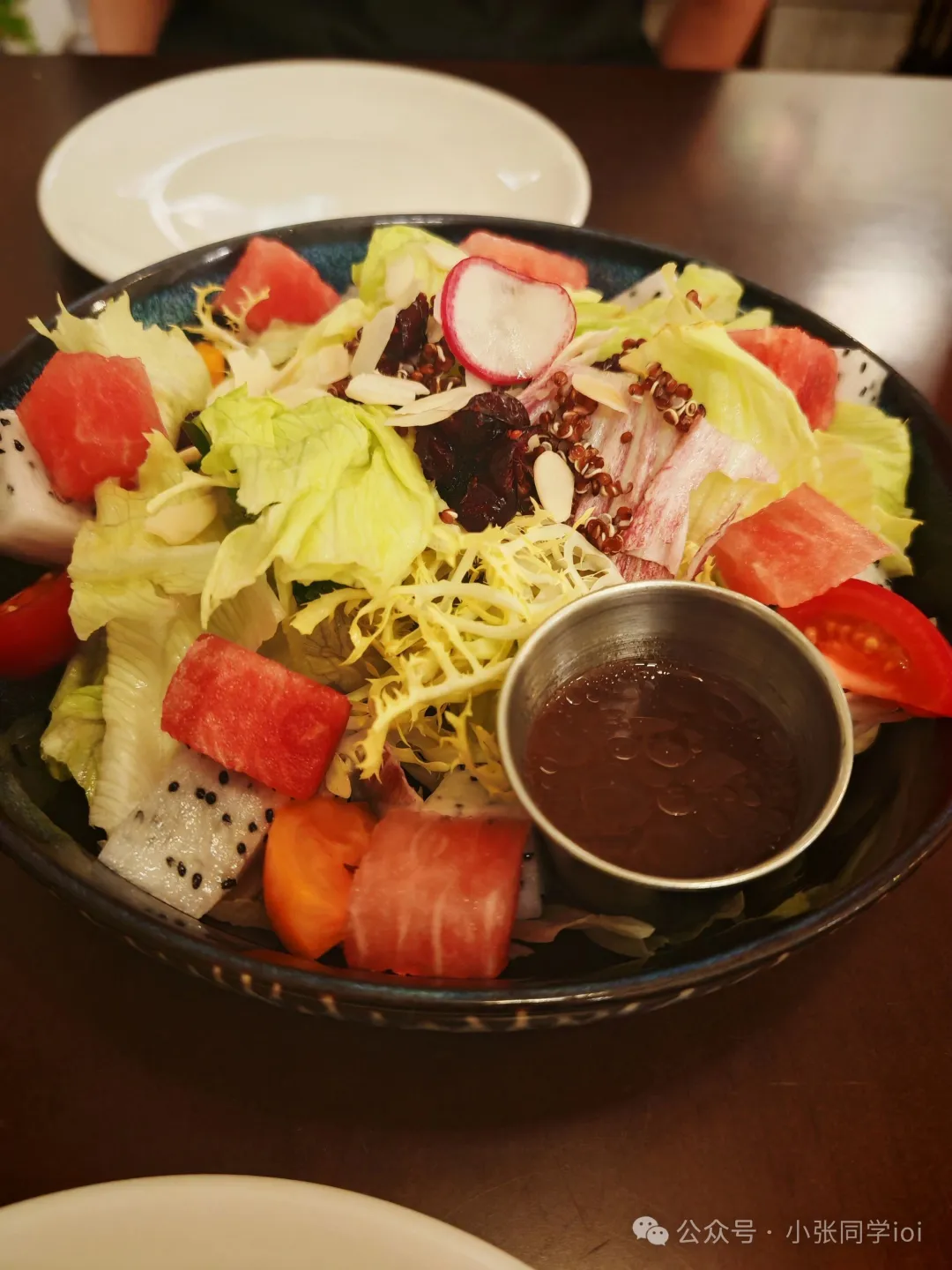 套餐里还有藜麦果蔬沙拉,本来想着清爽开胃,结果尝了后有点小失望。沙拉酱味道很奇特,不太合我俩口味,最后就只吃了里面的水果。不过呢瑕不掩瑜,在其他菜品的出色表现以及这场意外又浪漫的烛光晚餐面前,完全可以忽略。