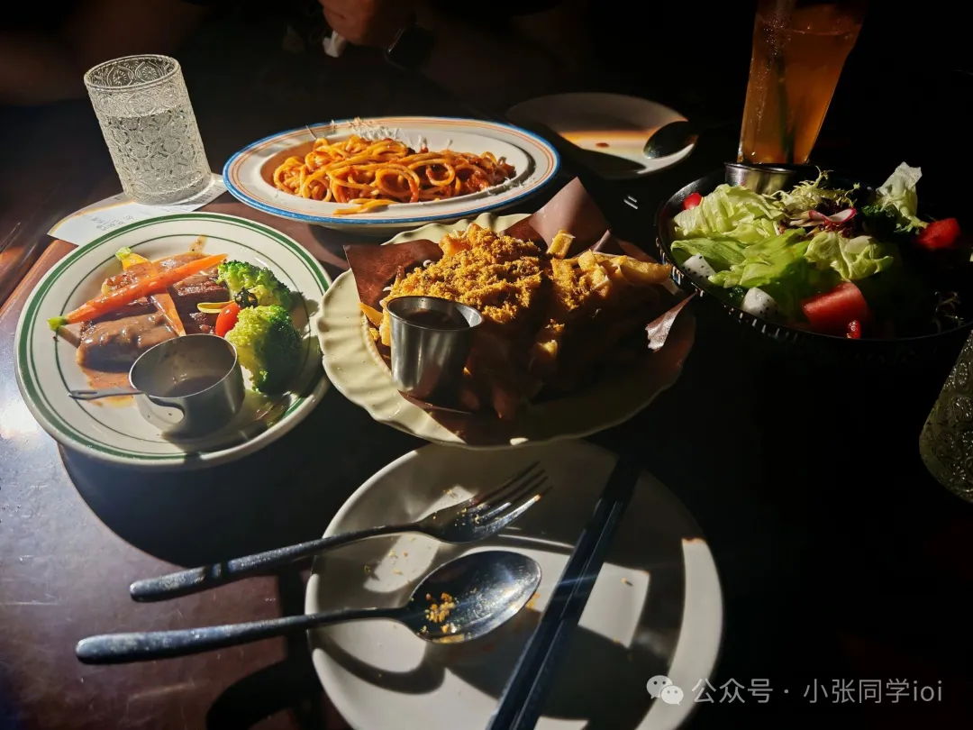 嫩煎黑椒小牛扒一上来,香气直接把我们吸引住。牛排煎得恰到好处,外皮微焦,内里鲜嫩多汁,黑椒香气渗进每一丝肉里。我和老婆切着牛排,你喂我一口,我喂你一口,肉香混着黑椒辛香在嘴里散开,那美妙滋味,让我们都忍不住感慨太好吃了,正准备大快朵颐时,店里突然暗了下来 —— 停电了!