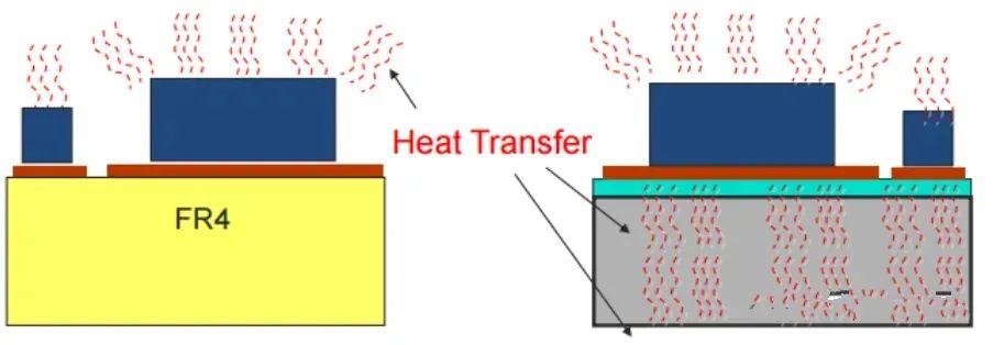 PCB散热示意图(左侧为FR4,右侧为金属基板)