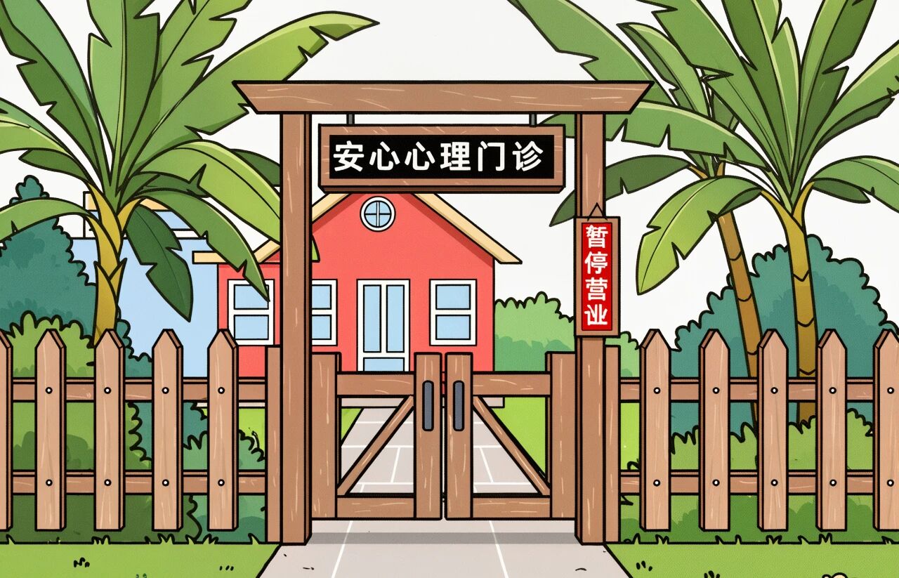像是一座小花园,抬头看见门楣上写着“安心心理门诊”。门上还挂着一块小木牌,写着“暂停营业”。透过篱笆的缝隙,可以看见花园里有一幢红墙、白窗棂、淡黄色屋顶的两层小楼,显得十分精巧。沿篱笆种着一排芭蕉和常青树,平添几分幽雅。