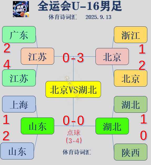 山东0-0(点球3-4)湖北:常规时间互交白卷,经过点球大战,湖北U-16男足闯进决赛,打破此前五次晋级四强无缘决赛的魔咒。另外,在昨天的中青赛U-19组比赛里,山东在点球大战4-3力克武汉获得冠军,两天内双方各自点球取胜一场,比分也相同。