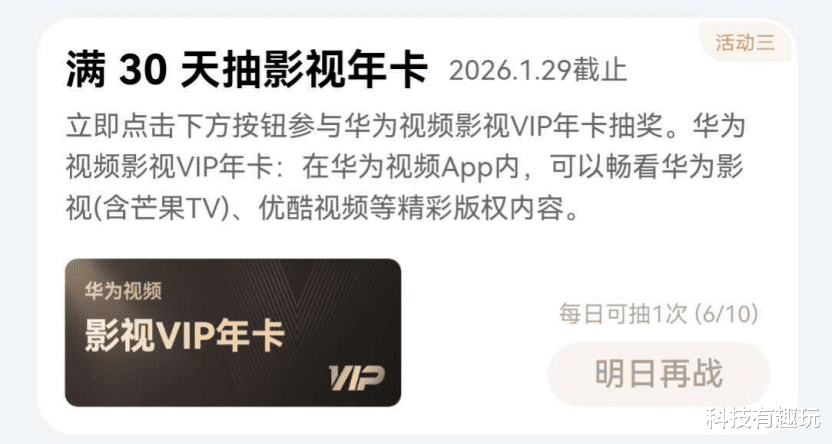 没错,对于我们这些已经完成首次签到的“老玩家”来说,真正的大奖现在才刚刚开始。从完成首次签到的第30天起,“鸿蒙有礼”活动页就会解锁活动三——抽奖活动。每天都有1次抽奖机会,最多可以连抽10天!而奖品,就是让所有追剧党狂喜的“影视VIP年卡礼包”!