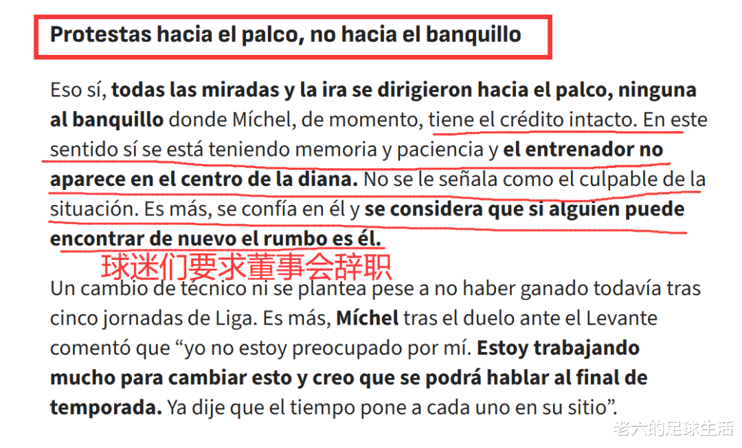 俱乐部现在的表现,米歇尔也不是罪魁祸首,最大的问题自然是管理层,面对莱万特比赛还没结束,许多球迷就离开球场抗议董事会,他们高喊董事会辞职的口号。