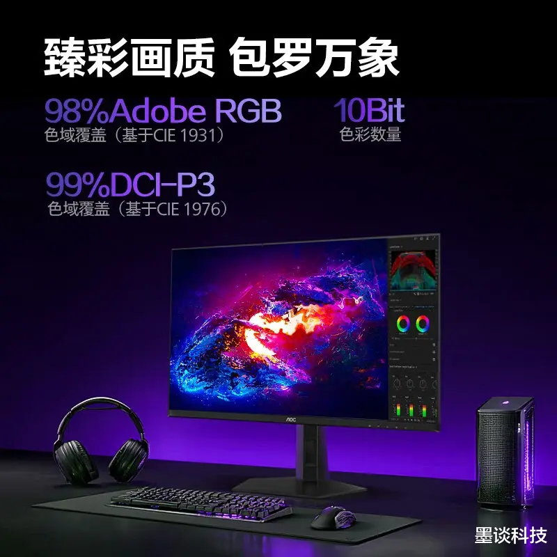 色彩表现方面,该显示器支持原生10位色深,并经过出厂色彩校准。每台设备均通过25点BU校准流程,色彩精准度Delta E值小于2。面板覆盖98% Adobe RGB色域与99% DCI-P3色域,这一专业级色彩表现使其也能满足创意设计工作的需求。
