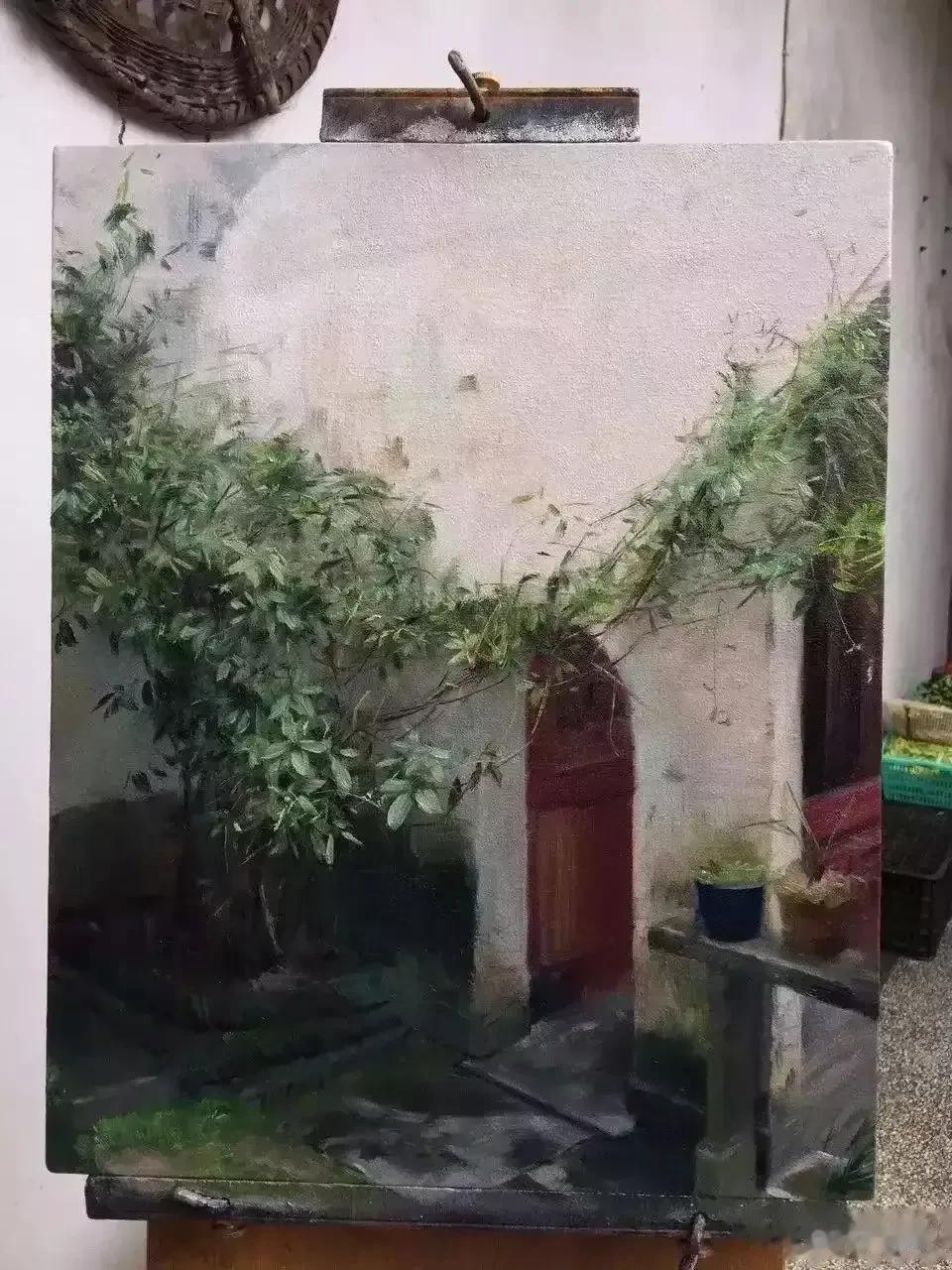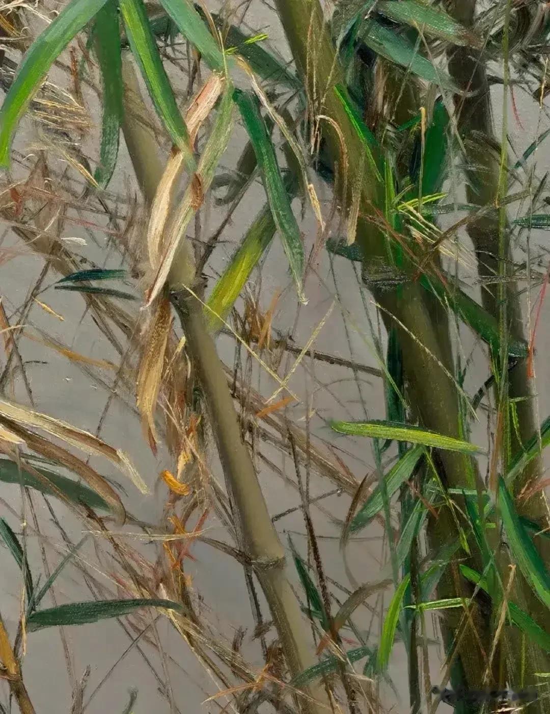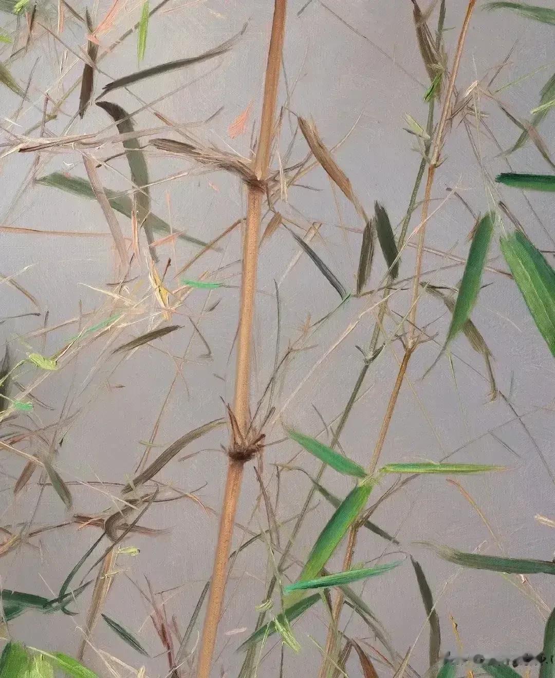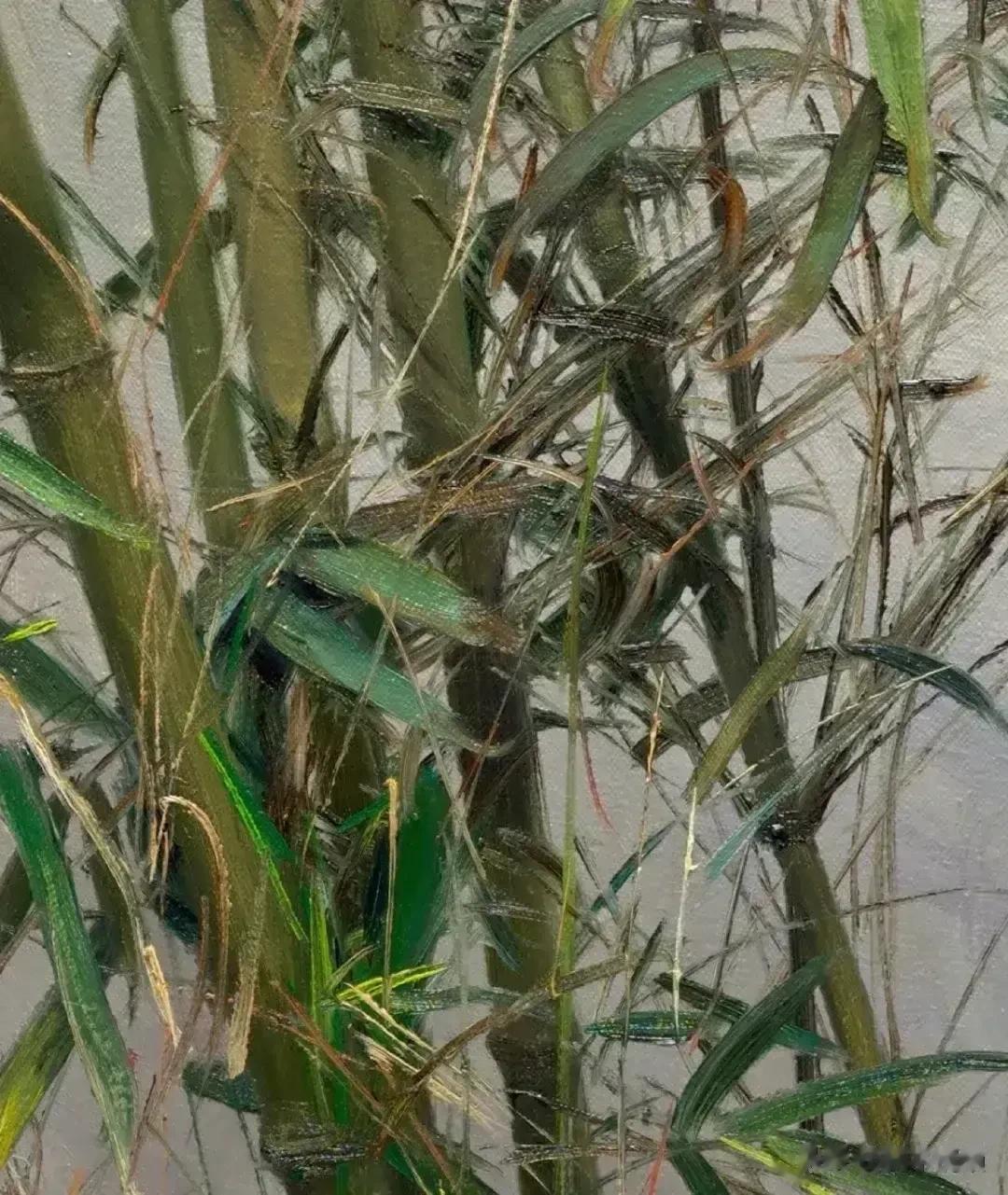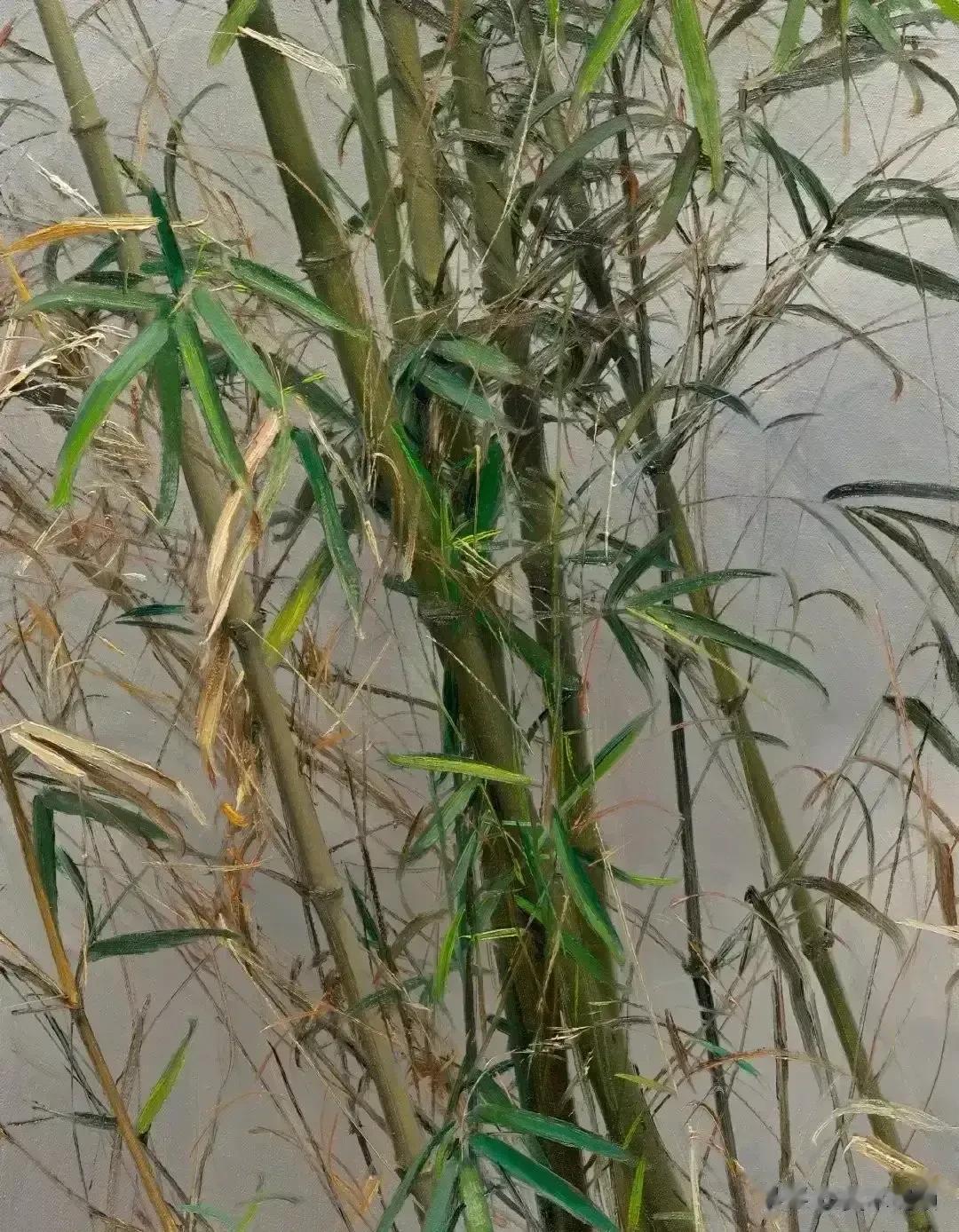 冷军的油画风景写生真是难得一见的艺术盛宴。就说他画竹子那幅,用油画表现竹子的并不多,他却做到了。古往今来文人雅客爱竹,苏东坡就说“宁可食无肉,不可居无竹”。竹根性韧,能在土里蛰伏五年后突然生长;竹笋鲜嫩可食;竹竿质坚能制兵器、做器具。