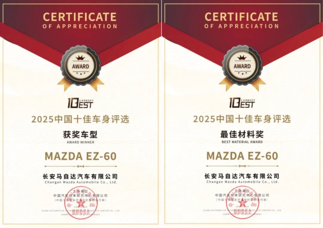 我暂时还没有试驾到马自达EZ-60这款车,但我注意到它已经斩获了「2025中国十佳车身」和「最佳材料奖」两项大奖。