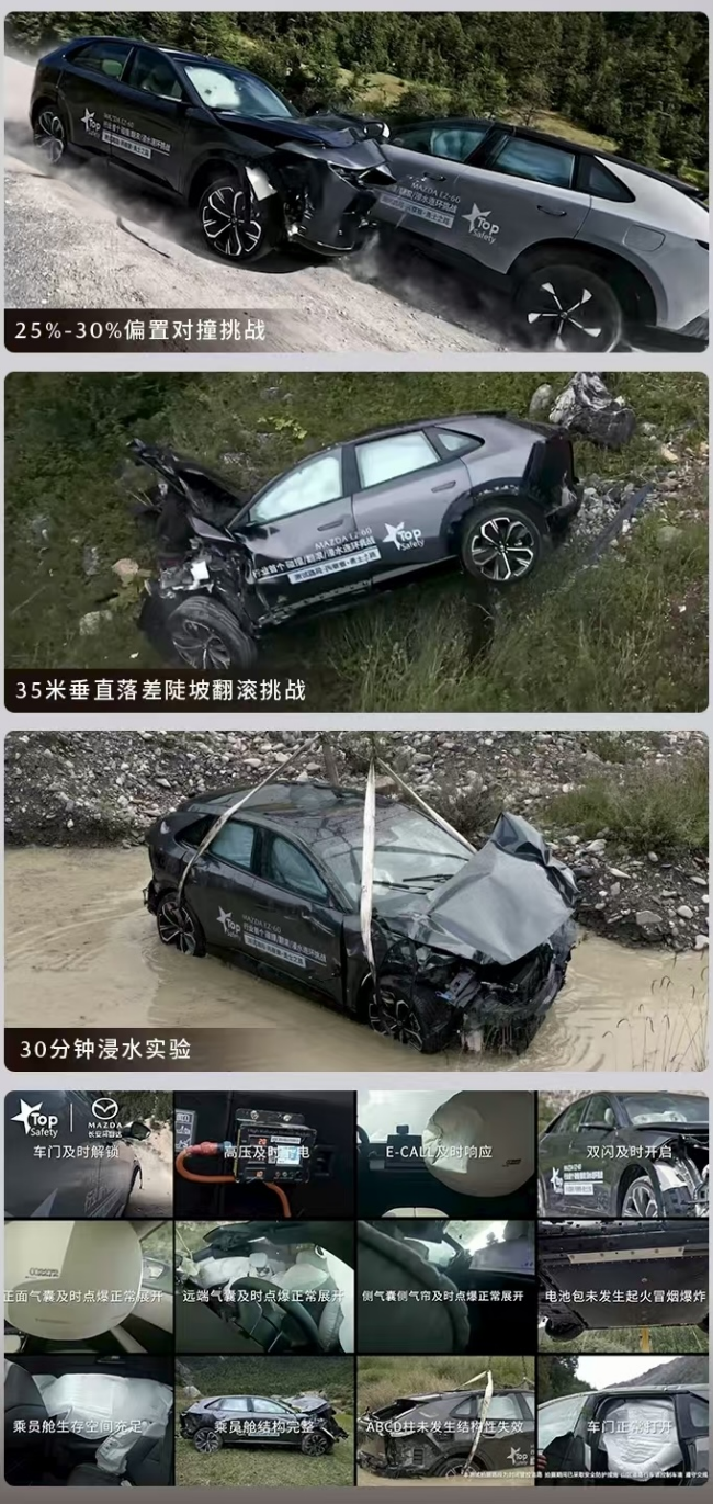 除了标准测试工况之外,长安马自达联合权威机构中汽中心在“勇士之路”丙察察成功完成「整车碰撞/翻滚/浸水连环挑战」,车辆乘员舱完整,A柱无变形,约束系统稳定工作,电池包也没有出现损伤,EZ-60因此获得“TOP Safety”顶级安全证书。