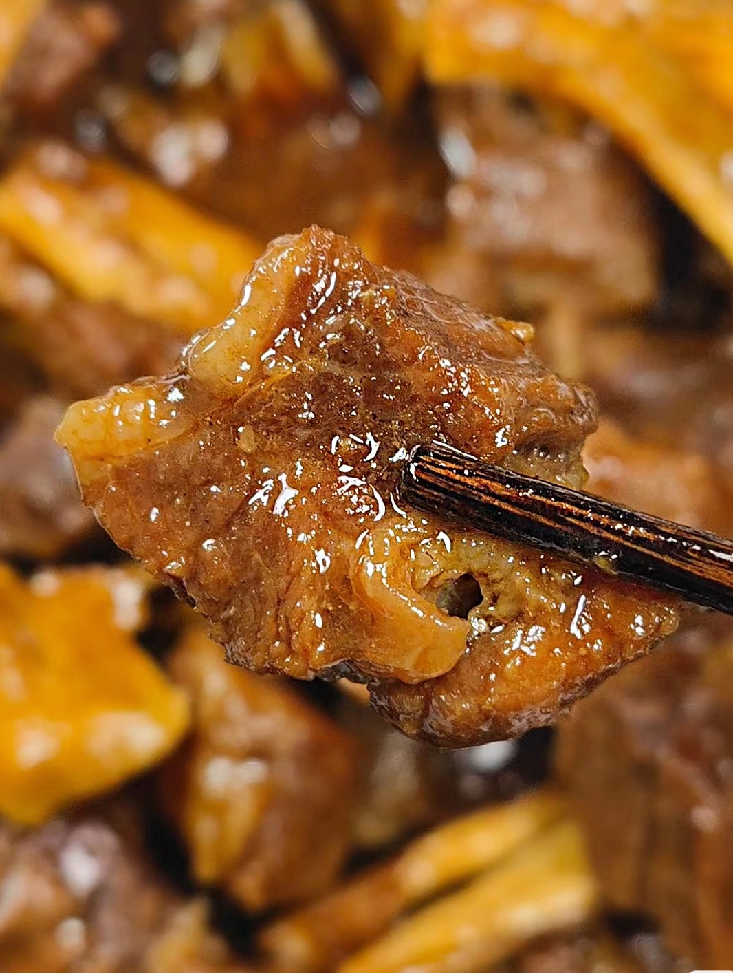 5. **加入腐竹**:待牛腩七成熟时,加入泡发好的腐竹,与牛腩同炖,使其充分吸收肉香。