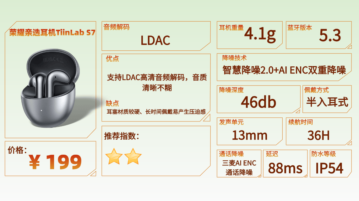 品牌2、荣 耀亲 选耳机TiinLab S7蓝牙耳机
