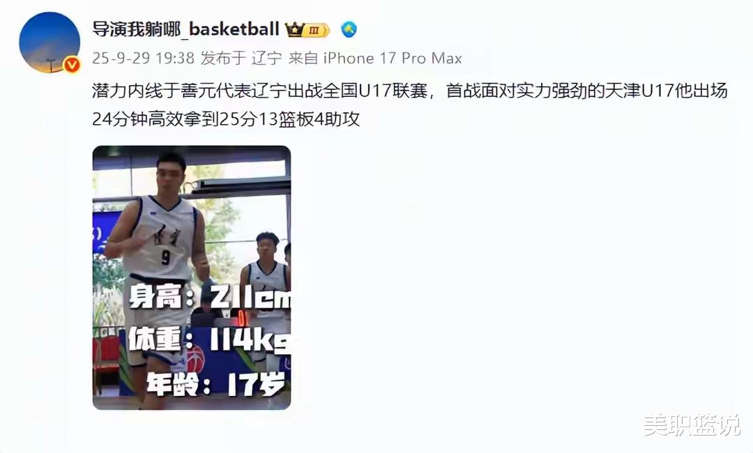 而对于辽宁男篮而言,最大的隐患还是内线问题,韩德君没退役的时候还能顶一顶,但是随着韩德君的退役,本土内线并没有人能弥补韩德君退役带来的影响,只能通过补强外援,但是这样也不是长久之计。不过近日,一场U17的比赛过后,辽宁男篮未来的内线有了目标。不久前全国U17联赛辽宁男篮和天津男篮的比赛后登上了热搜,原因是辽宁男篮队中涌现了一位不俗的内线球员,面对实力不俗的天津男篮,这位2.11米的内线表现异常出色,在出场24分钟的时间里全场高效率得到了25分13篮板4助攻数据。
