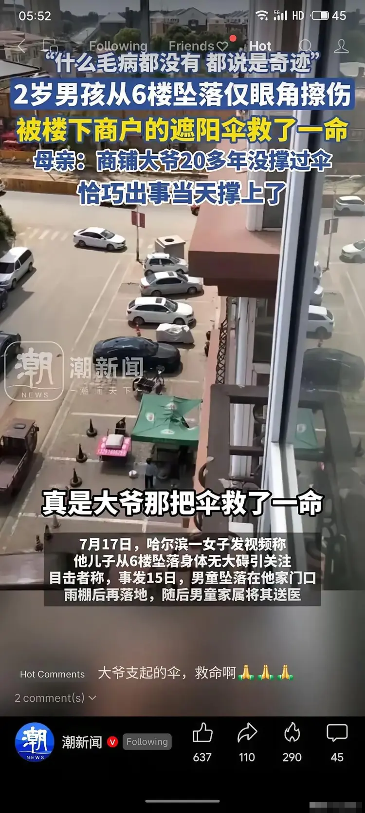 近日,在黑龙江哈尔滨发生了一起令人心惊胆战却又充满奇迹的事件。一名年仅2岁的男童不慎从6楼窗户的纱窗坠落,竟然仅眼角处受到轻微擦伤,而救下他一命的竟是楼下商铺的一把遮阳伞。据男童的母亲马女士透露,这把伞的主人大爷在此经营了20年,从未撑开过这把伞,恰巧在儿子出事的当天,大爷才决定将它支起。经过医院全面检查,男童身体并无大碍,医生们纷纷称之为“奇迹”。