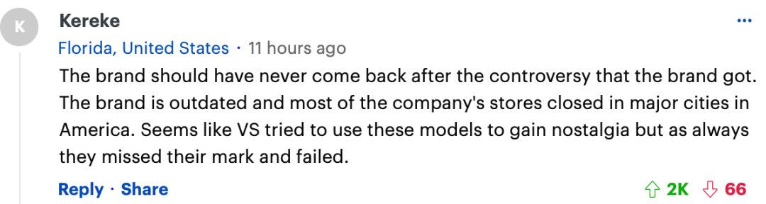 这个品牌已经过时了,该公司在美国主要城市的大多数商店都关门了。似乎 VS 试图利用这些模特来获得怀旧之情,但他们一如既往地错过了目标,失败了。”