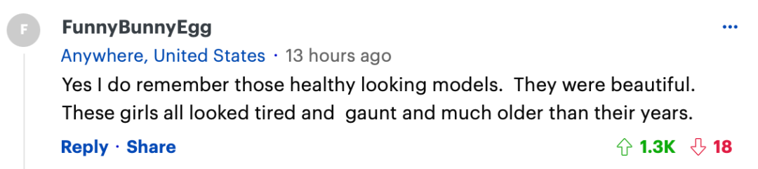 “是的,我确实记得那些看起来很健康的模特。她们很漂亮。这些女孩看起来都很疲惫、憔悴,比她们的年龄大得多。”