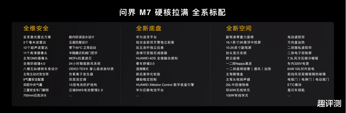 全新问界M7以超60项全系标配,包括激光雷达方案、华为乾崑智驾®ADS 4、华为途灵底盘、华为巨鲸电池平台等核心配置,涵盖全维安全、全能底盘、全新空间三大维度,硬核拉满全系标配,重塑国民SUV价值标准。