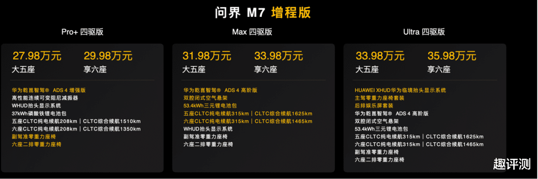全新问界M7增程版建议零售价为:问界M7增程Pro+大五座四驱版27.98万元起,增程Pro+享六座四驱版29.98万元起;增程Max大五座四驱版31.98万元起,增程Max享六座四驱版33.98万元起;增程Ultra大五座四驱版33.98万元起,增程Ultra享六座四驱版35.98万元起。