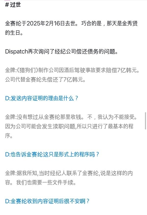 D社还提到,金秀贤的经纪公司曾向金赛纶追讨7亿韩元,但后来澄清这只是走过场,实际并未真正追讨。