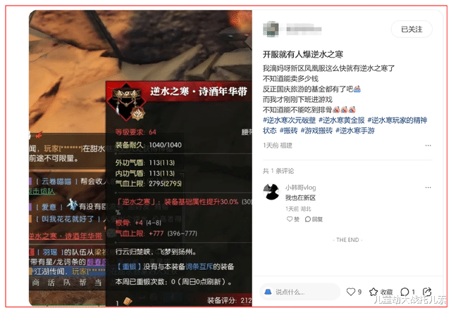 还有大学生晒出自己的淘金纪实:和队友打个本就曝出了凤凰服第一个含有“逆水之寒”稀有词条的装备,只不过是红色装备,估计卖个1000元以上,不过,凤凰服大佬云集,听说刀削面、会心流、浮夸都回归,大佬竞争之下说不定还能卖出更高价格,这下,国庆旅游基金是有了。