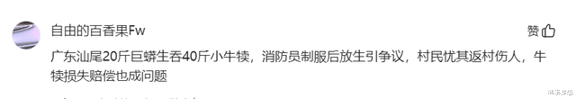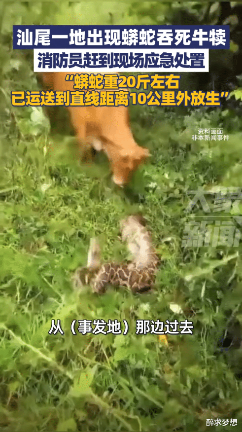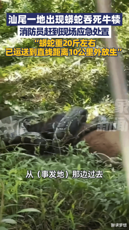 广东汕尾20斤巨蟒生吞40斤小牛犊,消防员制服后放生引争议,村民忧其返村伤人,牛犊损失赔偿也成问题
