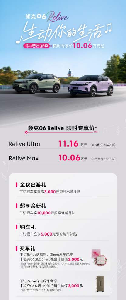 为进一步贴合年轻群体的预算需求,领克06Relive在十月推出多重购车优惠政策。当前该车型限时专享价10.06万元起;十月期间下订提车,可享至高3000元限时金秋出游补贴礼、10000元超享焕新礼与5000元限时购车礼,交车时还可获得额外惊喜。针对Ultra与Max两个版本,提供专属选配优惠;金融方案方面,推出5年期贷款10万3年0息政策,月供低至1668元起,大幅降低首付与月供压力,让年轻人无需过度透支资金,即可购入心仪车型。