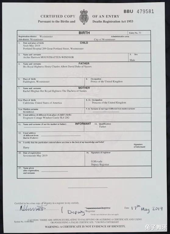 在儿子阿尔奇的出生证明上,其父姓名登记为"萨塞克斯公爵亨利·查尔斯·阿尔伯特·大卫殿下"。