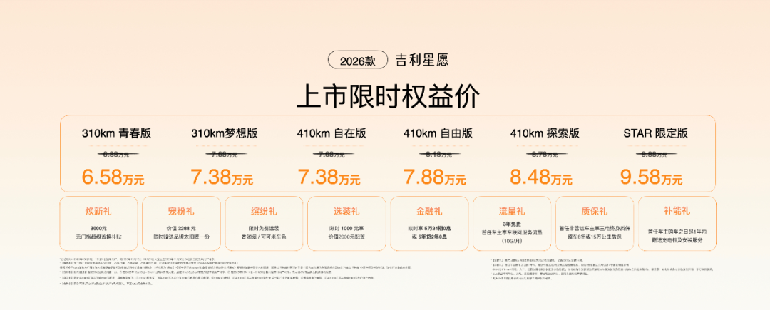 2026款吉利星愿上市限时权益价为6.58万元–9.58万元。同时为回馈用户支持,同步推出八重限时购车权益,包括焕新礼、宠粉礼、缤纷礼、选装礼、金融礼、流量礼、质保礼、补能礼,进一步降低拥车门槛,提升用车体验。