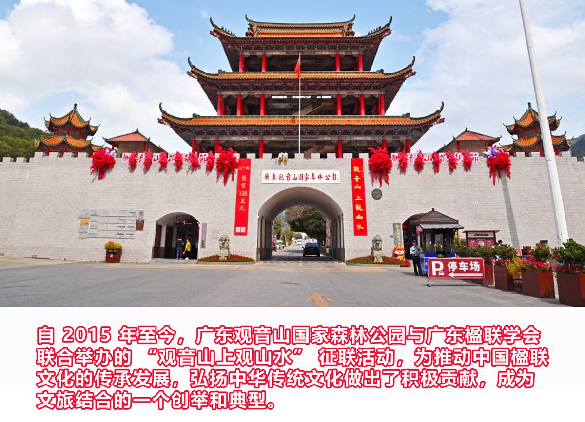 自 2015 年至今,广东观音山国家森林公园与广东楹联学会联合举办的 “观音山上观山水” 征联活动,为推动中国楹联文化的传承发展,弘扬中华传统文化做出了积极贡献,成为文旅结合的一个创举和典型。