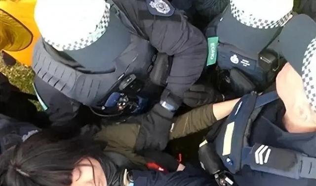 这个举动简直就像个“疯子”,澳大利亚警局紧急出动在街上制止了这场活动,根据现场的图片来看,有一名警察直接掐住了许秀中的脖子,防止她继续煽动情绪。