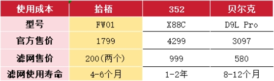 拾梧FW01整机售价1799元,滤芯两只装仅200元,平均寿命4-6个月,年均维护费用低,整体投入相对轻松。相比之下,352 X88C售价高达4299元,滤芯单价999元,虽然寿命长达1-2年,但整体购机成本过高,前期压力较大。贝尔克D9L Pro售价3097元,滤芯单价580元,寿命在8-12个月之间,年均使用成本中等偏上。